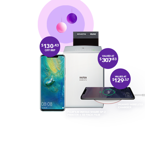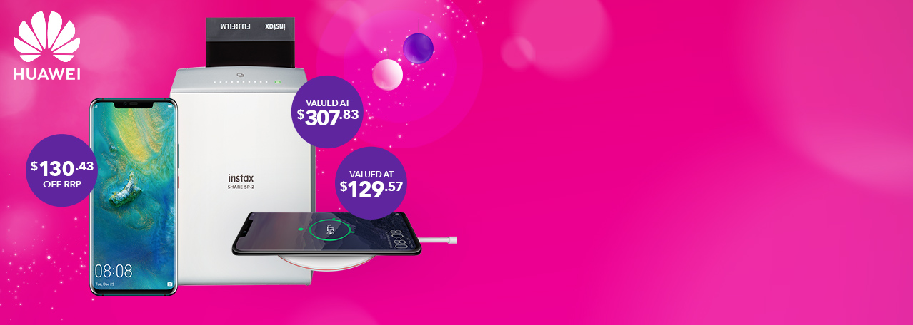 Get $130.43 off the value of the phone and a bonus Fujifilm Instax Share SP-2 Photo Printer when you buy a Huawei Mate20 Pro, interest free over 24 months while on a $52.17 and above open term Pay Monthly plan. Plus, get a bonus Huawei Wireless Charger.
